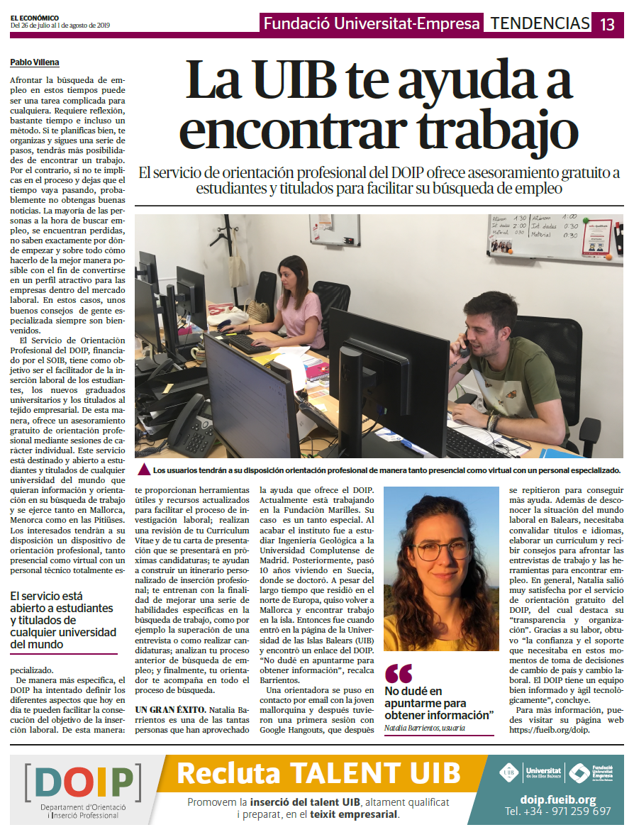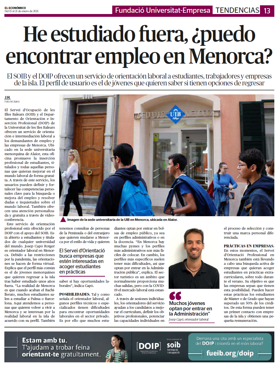 El DOIP és un departament de la FUEIB adreçat als universitaris i a les empreses per a afavorir l'ocupació dels universitaris de les Illes Balears.